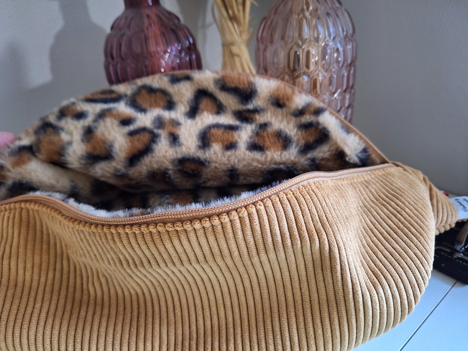 Fait en tissu velours cotelé pour l'extérieur et tissu fausse fourure léopard pour l'intérieur.