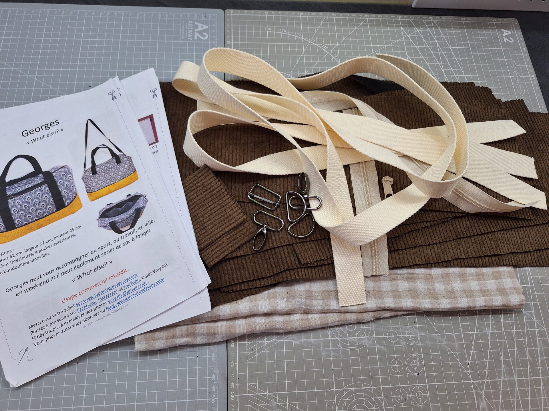 Celui-ci est fait en tissu velours côtelé marron et tissu carreau marron.