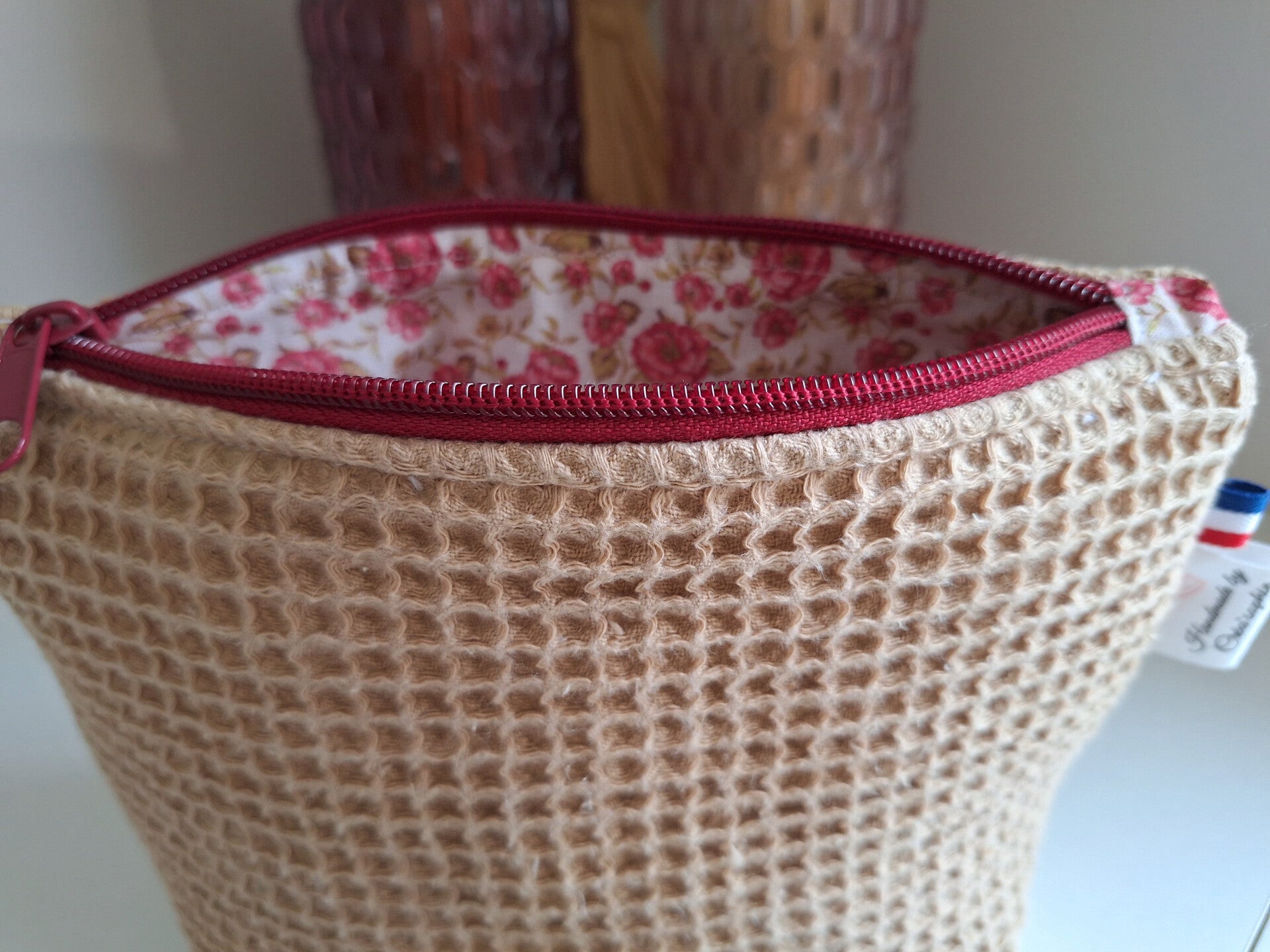 Fait en tissu nid d'abeille et tissu imprimé fleur.