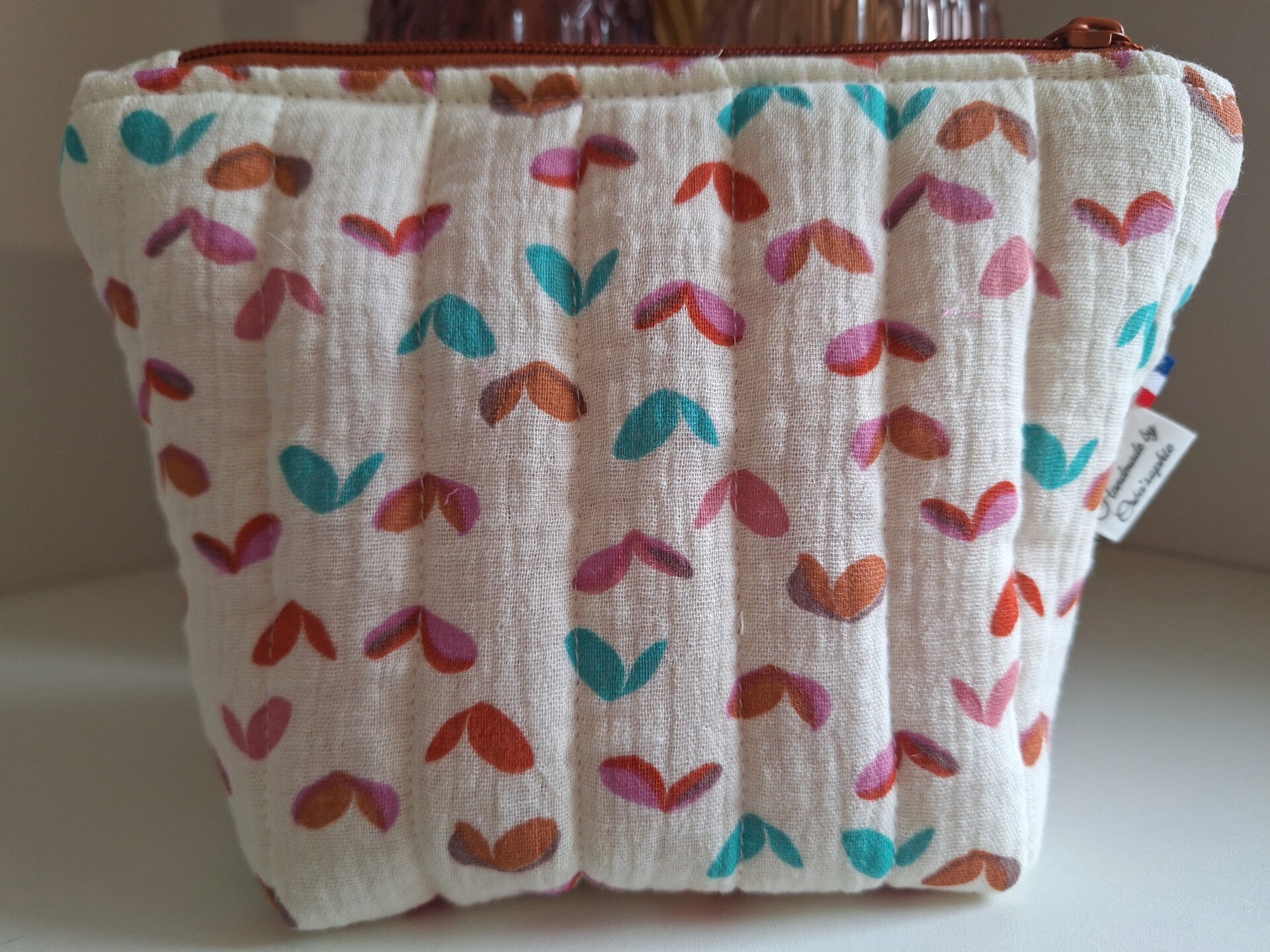 Fait en tissu gaze de coton imprimé matelassé extérieur et tissu gaze de coton uni intérieur.